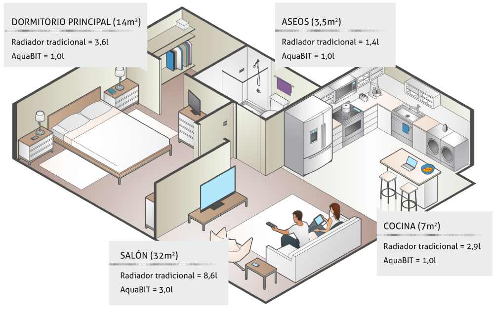 Aquabit conjuntamente con los nuevos sistemas de producción de calor con agua a baja temperatura, consigue reducir