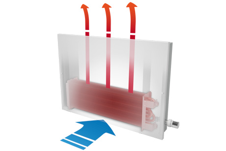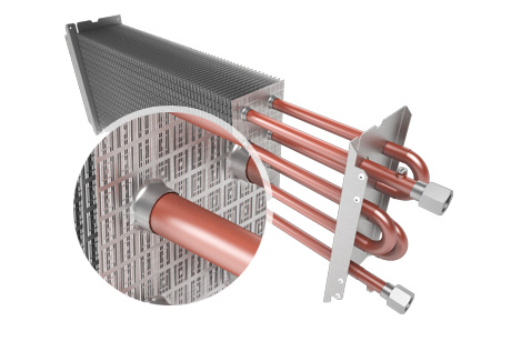 Los tubos interiores distribuyen el agua caliente uniformemente por todo el intercambiador, transmitiendo el calor a las pletinas de aluminio que lo conforman, y estas a su vez lo transmiten al ambiente.